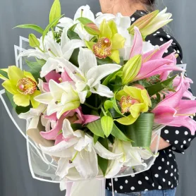 Букет с лилиями - это символ нежности и женственности. Эти цветы обладают тонким ароматом и красивым внешним видом. Лилия идеально подходит для создания романтического настроения и для красивого комплимента прекрасной возлюбленной. Орхидеи в букете выглядит креативно и привлекательно.
