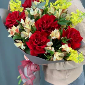 Букет из красных французских роз и альстромерий