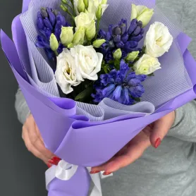 Этот букет — сама нежность ранней весны, застывшая в изящной форме. Его сердце составляют пышные, будто восковые, соцветия гиацинтов в сине-сиреневых тонах. Каждое соцветие — это миниатюрная кисть, усыпанная десятками крошечных цветков. Но главное волшебство раскрывается не сразу для глаза, а для обоняния: от гиацинтов исходит пряный, сладковатый и глубокий аромат, удивительно напоминающий цветущую сирень. Это густое, бархатистое благоухание, которое окутывает пространство, даря ощущение цветущего майского сада
