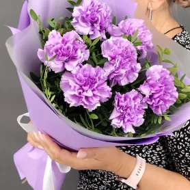 Букет из нежных гвоздик лавандового оттенка, элегантно упакованный в лиловую бумагу с белой лентой, излучает мягкую элегантность и безмятежность. Пышные цветы в сочетании с зеленью создают гармоничную композицию, идеальную для выражения признательности и любви. Этот букет станет прекрасным подарком, наполненным искренними чувствами.