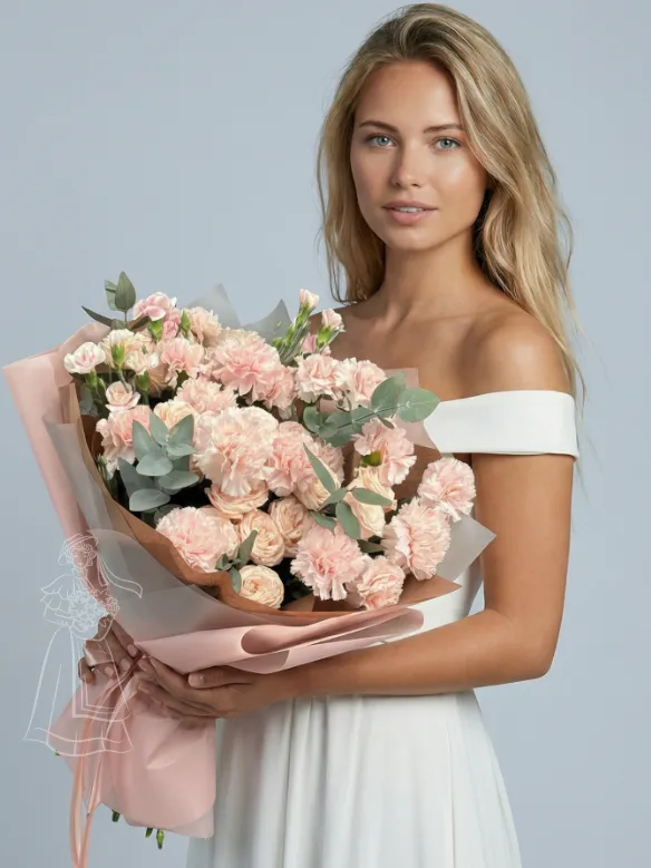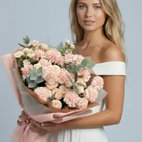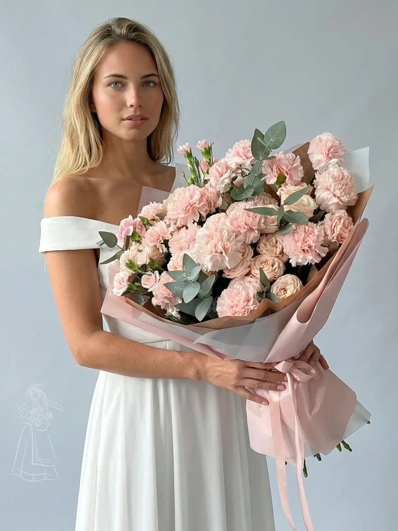 Этот букет - нежное облако из розовых гвоздик и кустовых роз, напоминающее о рассвете. Изысканная композиция, дополненная зеленью эвкалипта, привнесет в ваш дом утонченность и весеннее настроение.