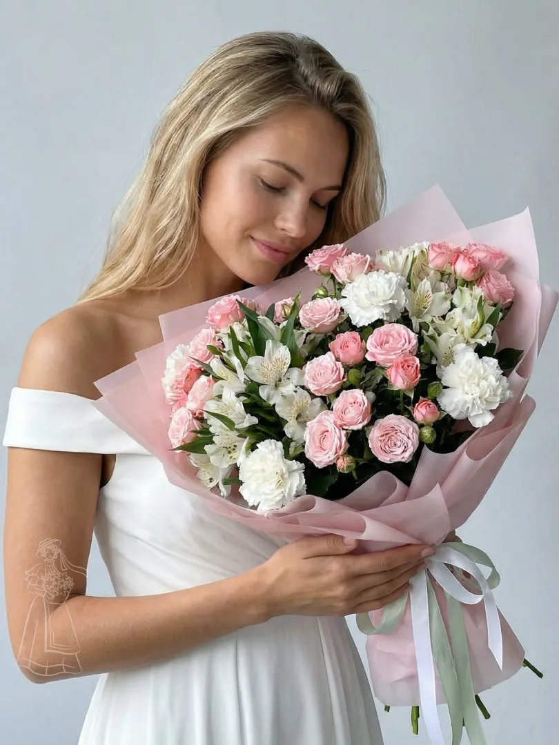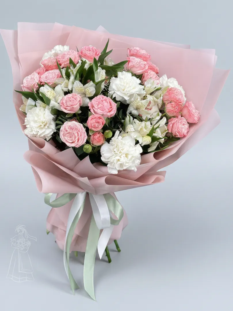 Этот воздушный букет, словно нежный рассвет, наполнен очаровательными розовыми розами, утонченными белыми цветами и изящными веточками альстромерии. Он окутан в полупрозрачный розовый папирос, перевязанный атласными лентами, создавая образ совершенной элегантности и теплоты.
