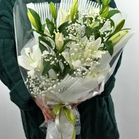 Букет из белой ароматной лилии - это прекрасное сочетание красоты, нежности и аромата. Он создаст атмосферу уюта и радости, наполнив пространство свежим и приятным ароматом.