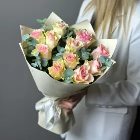 Букет из 11 розовых роз с эвкалиптом (0103)