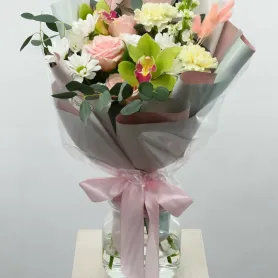 Нежный букет с розами, цимбидиумом и ароматной матиолой