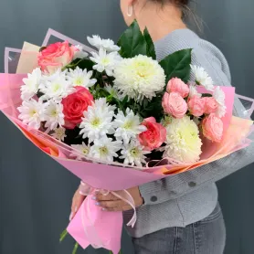 Букет с хризантемами и кустовой розой