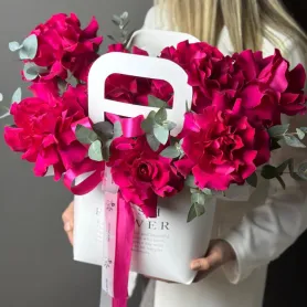 Сумка с ярко- розовыми французскими розами и ароматным эвкалиптом.