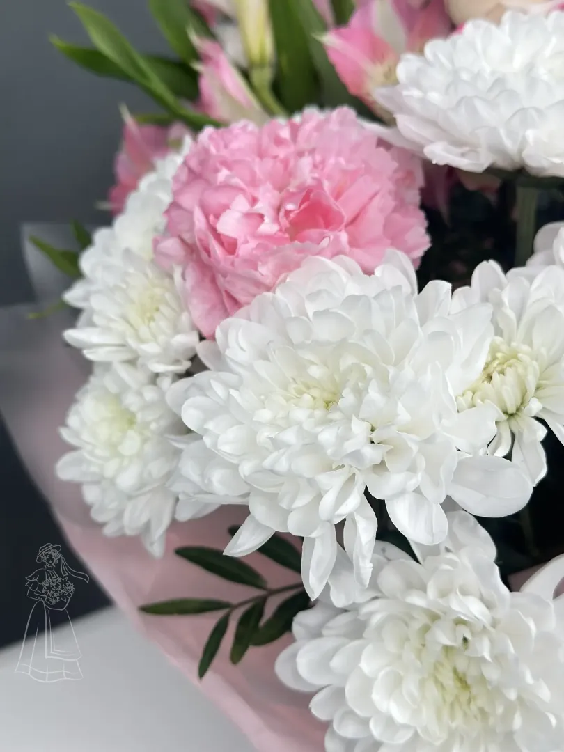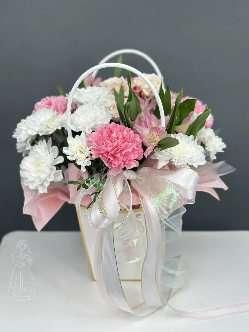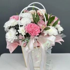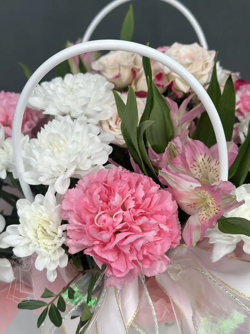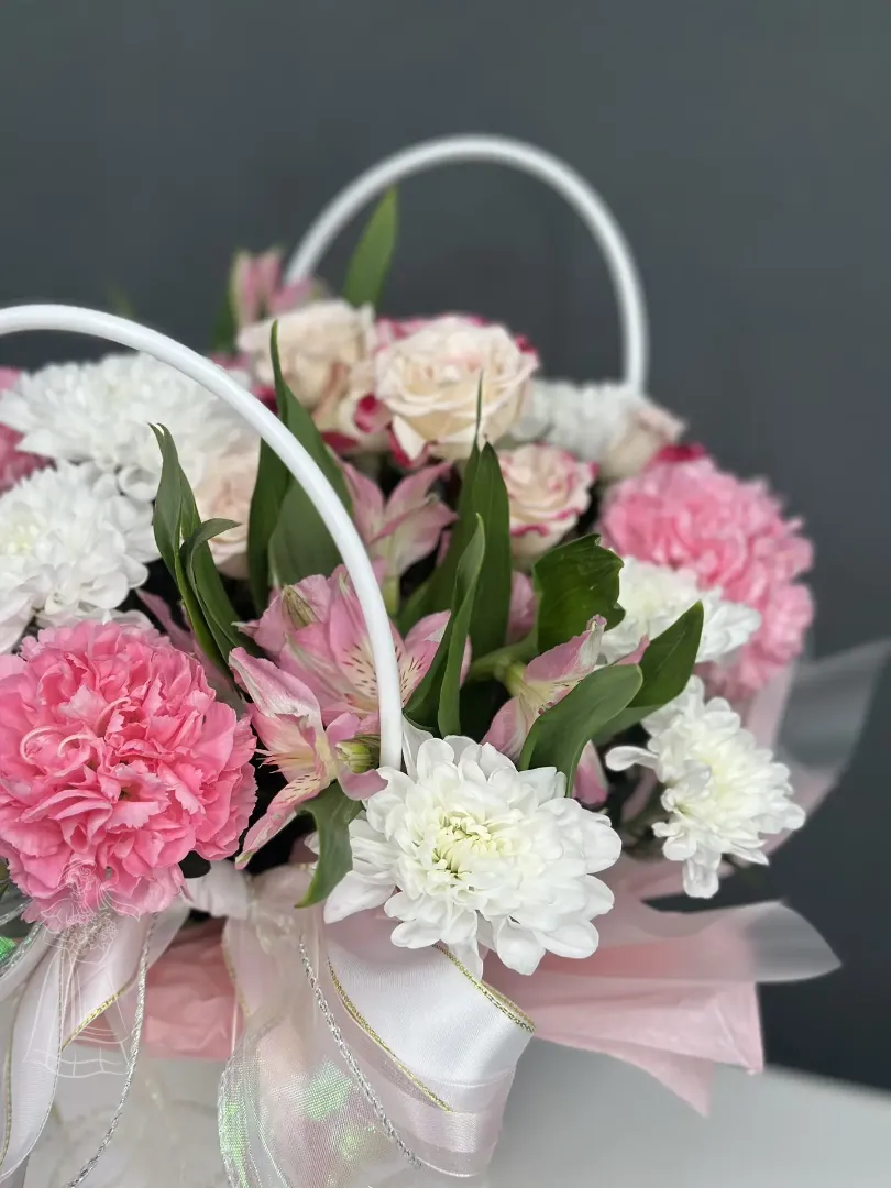 Нежный букет в элегантной корзинке - идеальное воплощение изысканности и весны. Сочетание белоснежных хризантем, розовых гвоздик и альстрёмерий, перевязанное фактурной лентой, принесёт радость и очарование. Этот композиция станет прекрасным подарком, полным света и тепла.