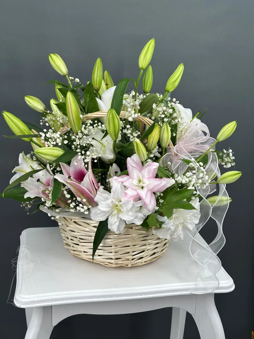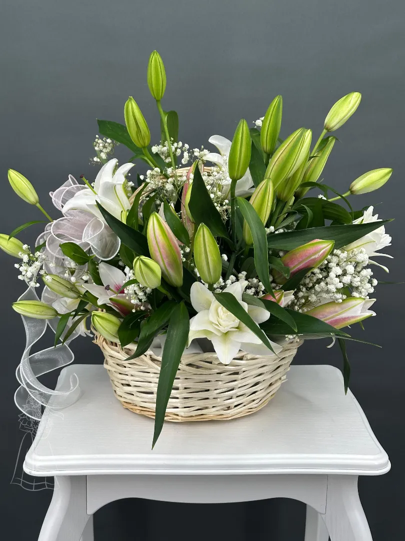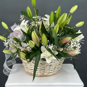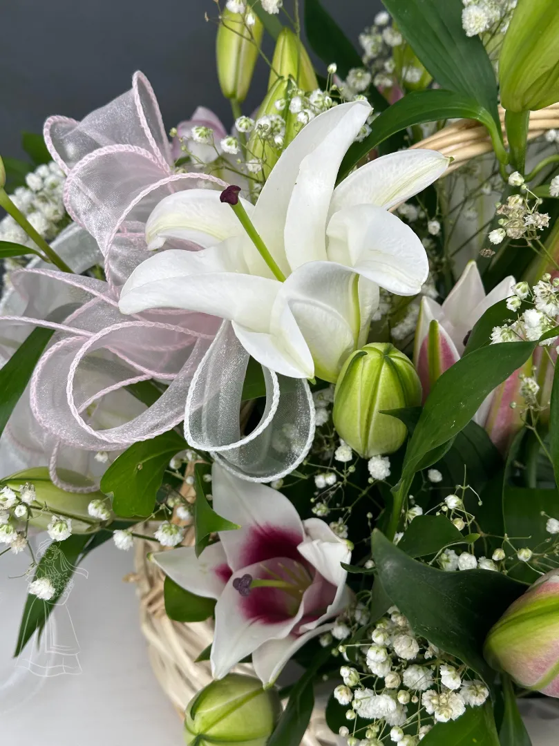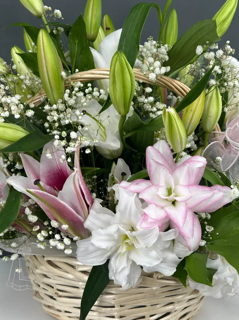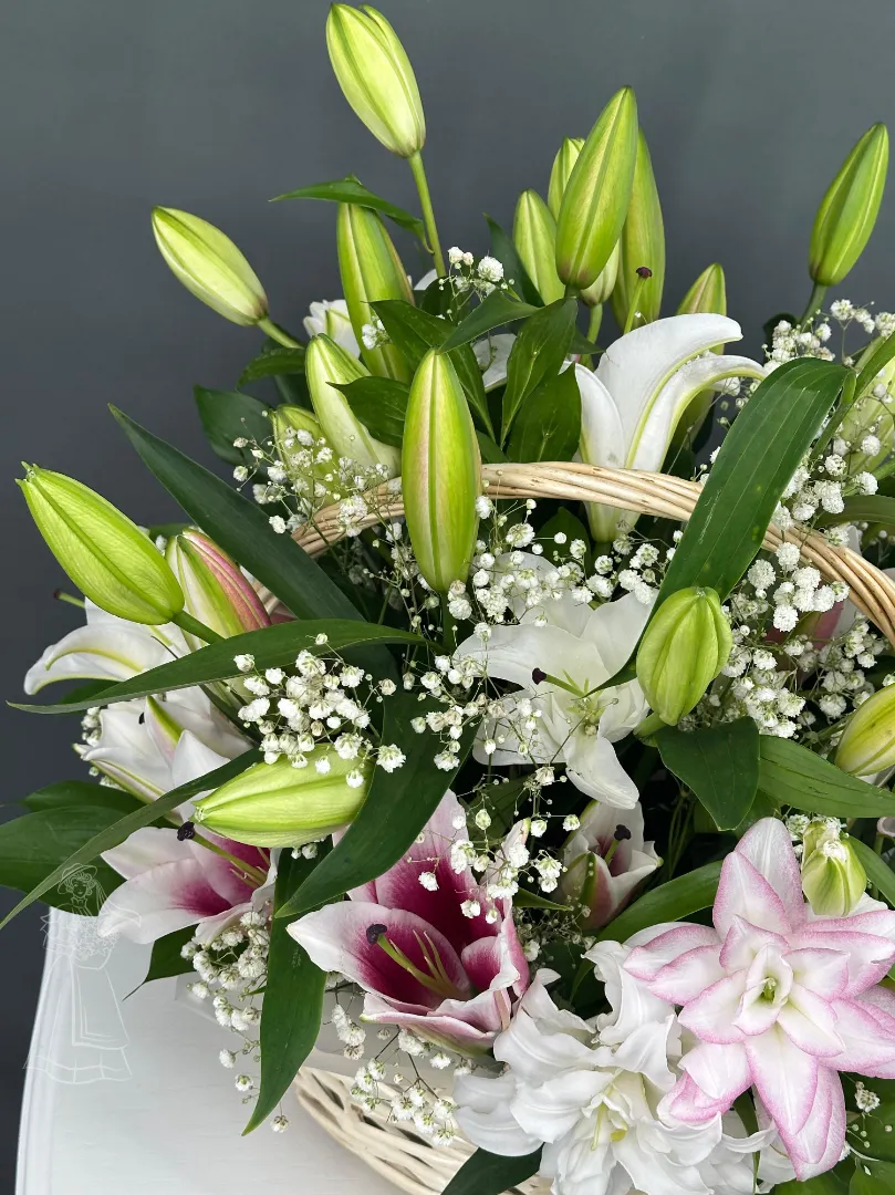 Воздушная композиция из лилий в корзине