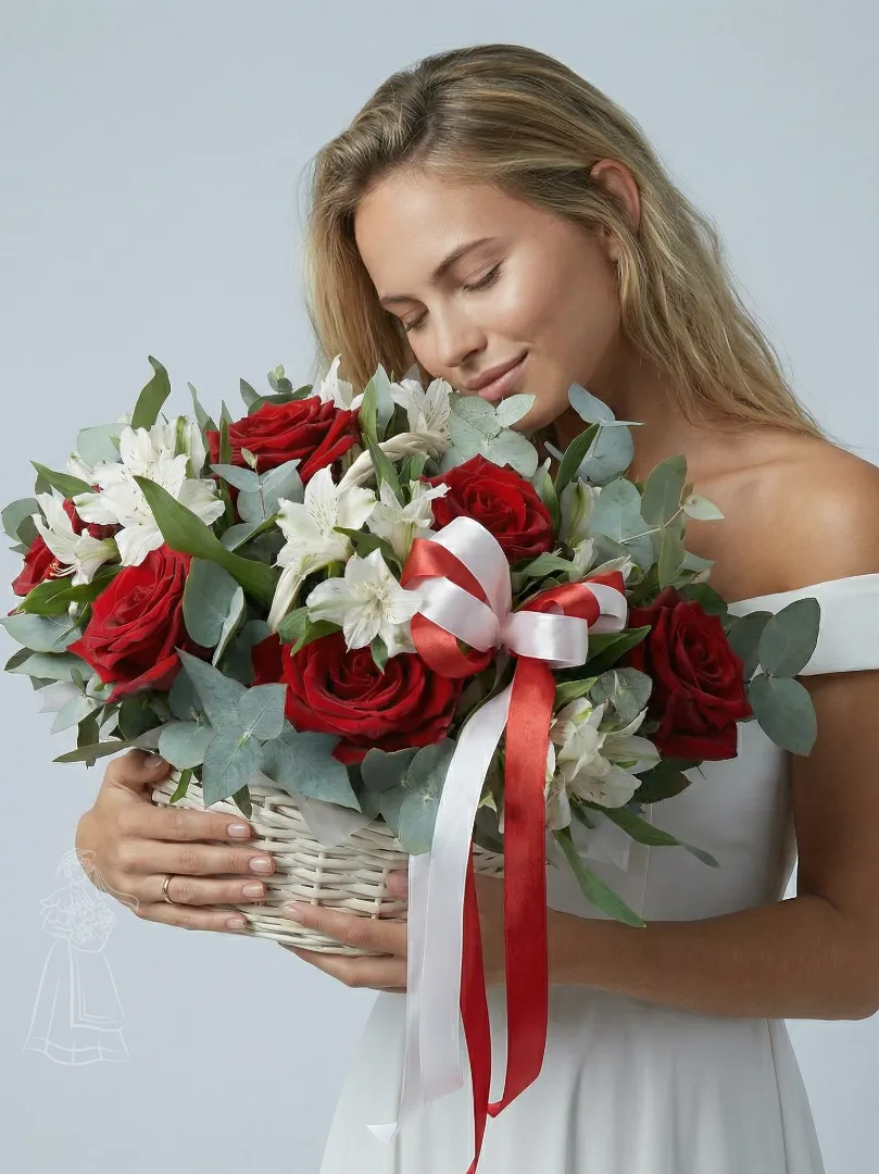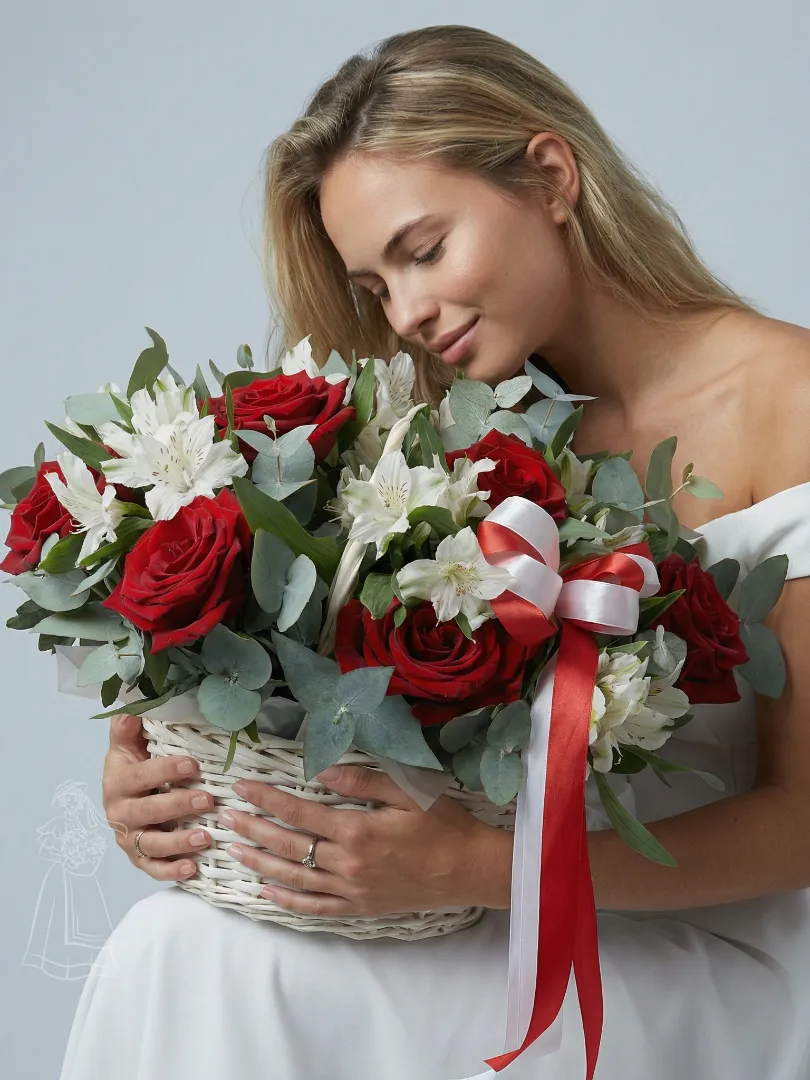 Красивая корзина из красных роз и белых альстромерий