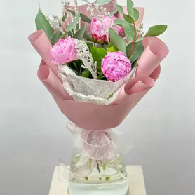 Изысканный букет из ароматных нежно-розовых пионов — настоящее воплощение нежности и утонченности. Каждый цветок, словно лепесток мечты, излучает тонкий, сладкий аромат, который наполняет пространство атмосферой романтики и уюта. Пионы, символизирующие любовь и счастье, создают гармонию и придают этому букету особую магию.