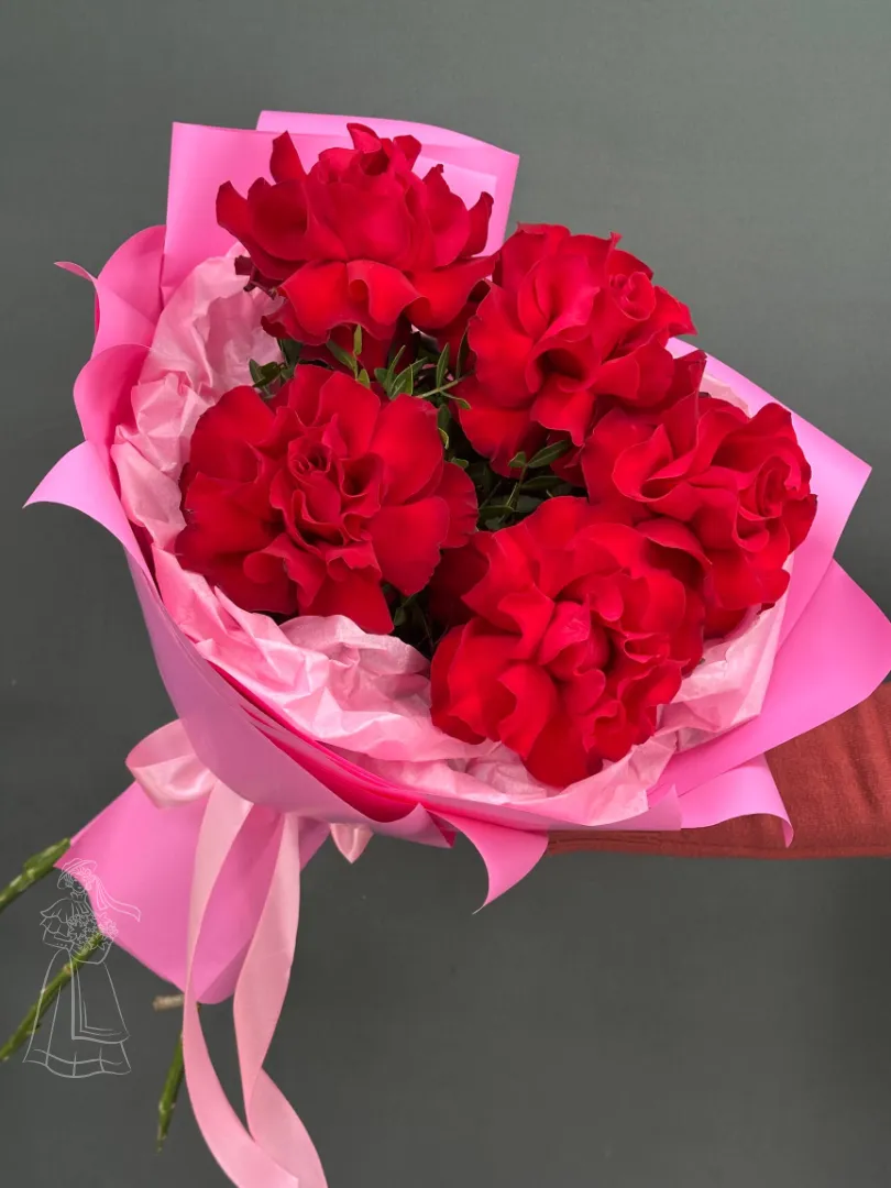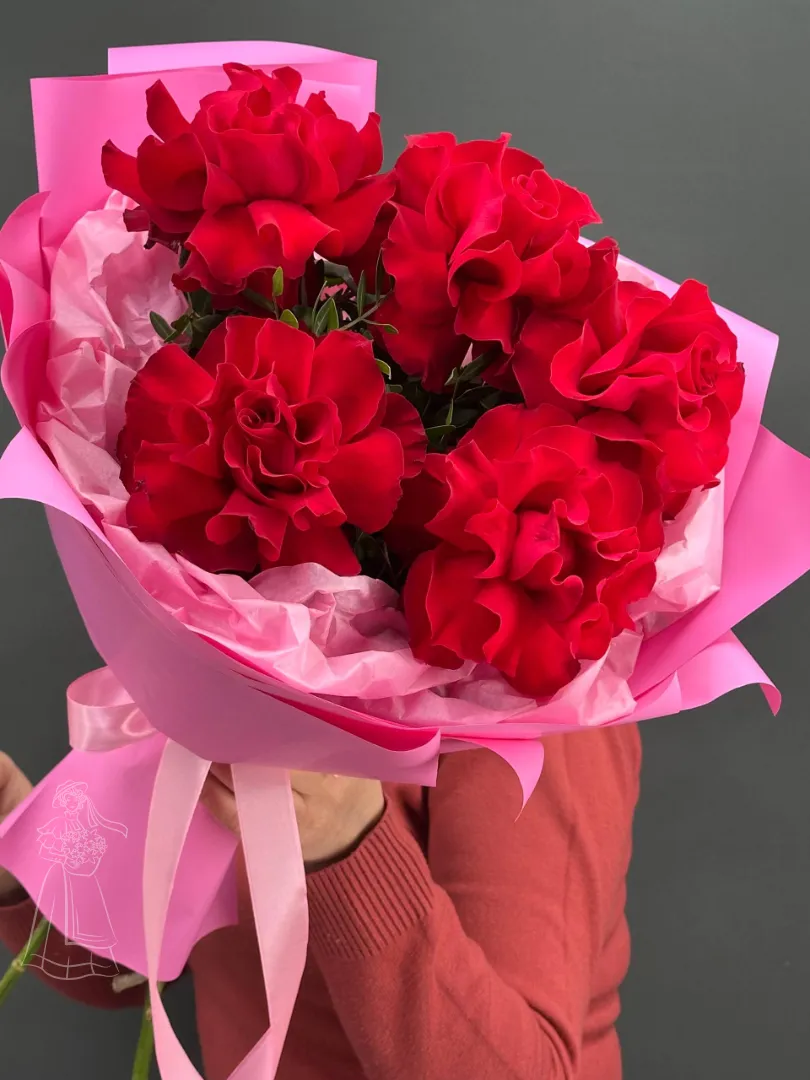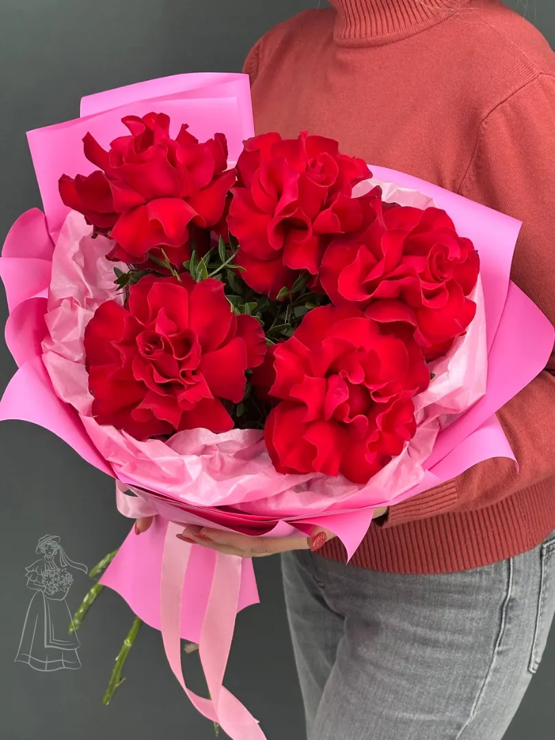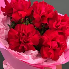 Букет, состоящий из ярких роз, великолепно подойдёт для подарка близкому человеку. Нежные оттенки обертки выгодно дополняют благородный красный цвет бутона. Композиция точно передаёт всю гамму чувств и станет прекрасным выражением любви и признательности.
