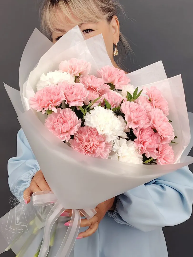 «Нежный букет из розовых и белых гвоздик, элегантно упакованный в белую бумагу с атласной лентой. Этот букет станет прекрасным подарком для любого случая, наполняя пространство теплом и уютом. Идеальное сочетание цветов и упаковки создаст незабываемое впечатление.»