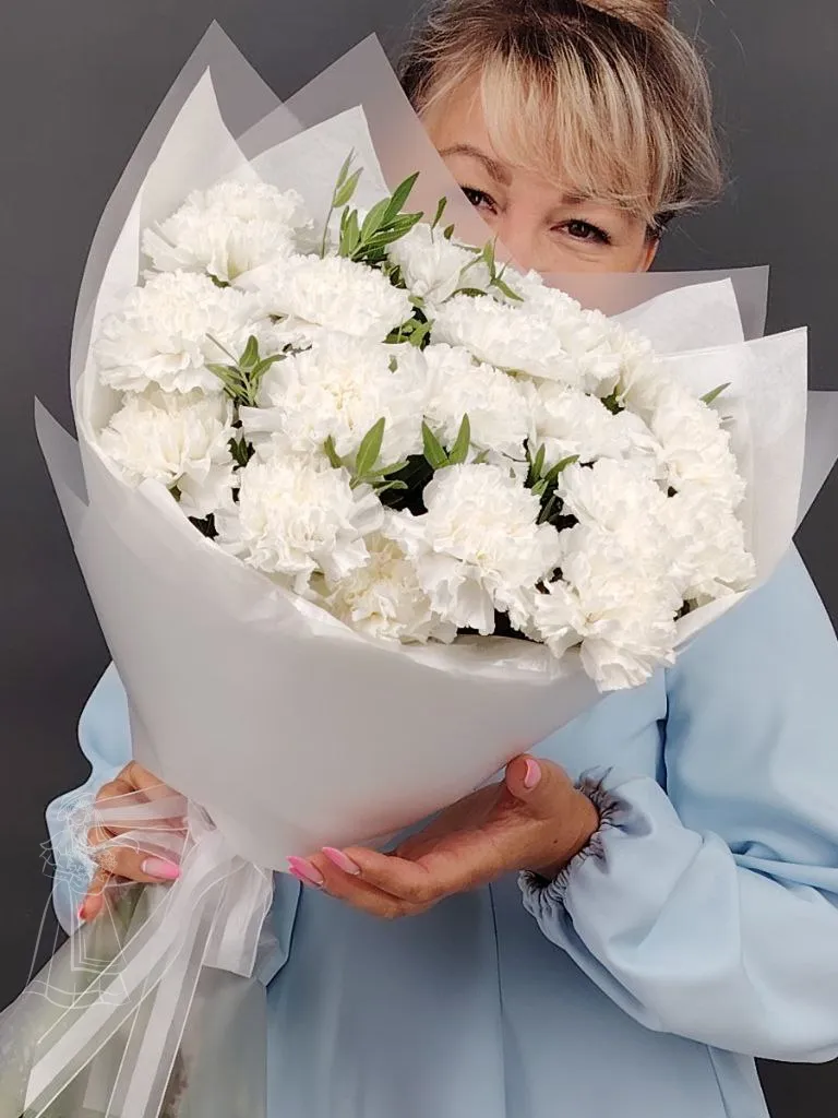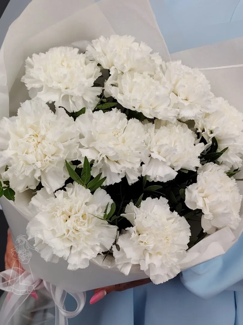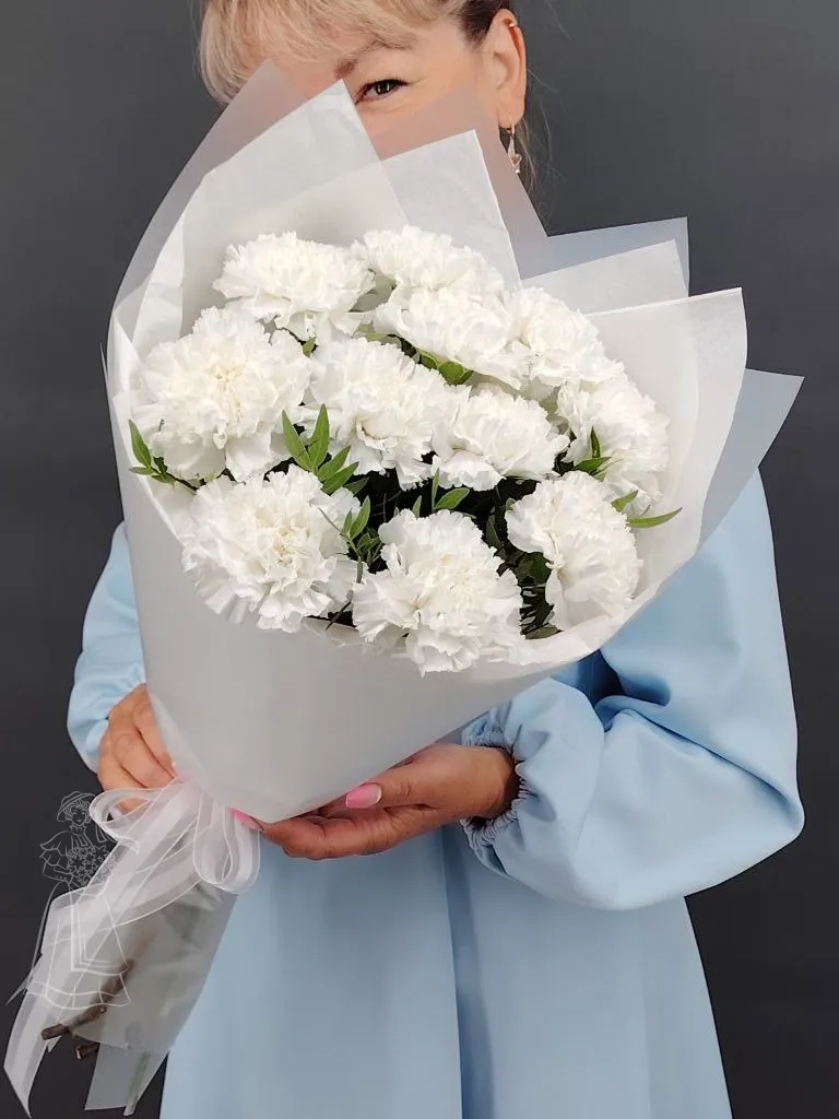 Букет «Элегантность» Стильный букет из белых гвоздик. Нежные цветы создают атмосферу чистоты и свежести, идеально подходящую для любого торжества. Этот букет станет прекрасным подарком для тех, кто ценит классическую красоту и сдержанный стиль.