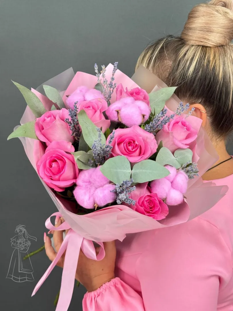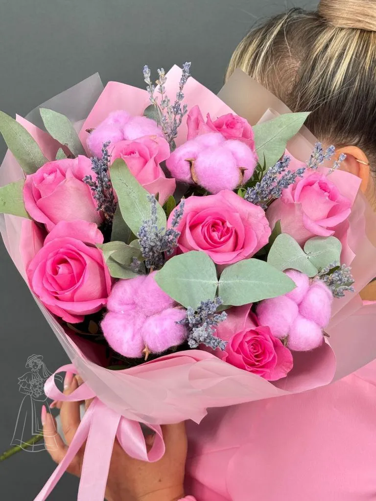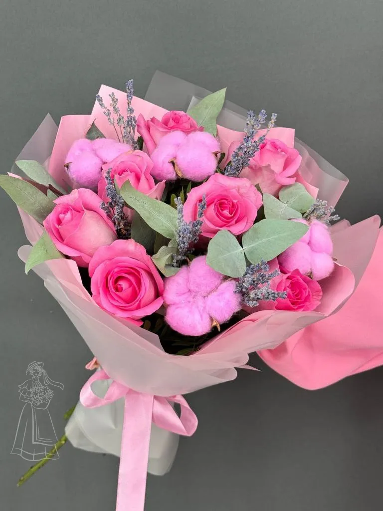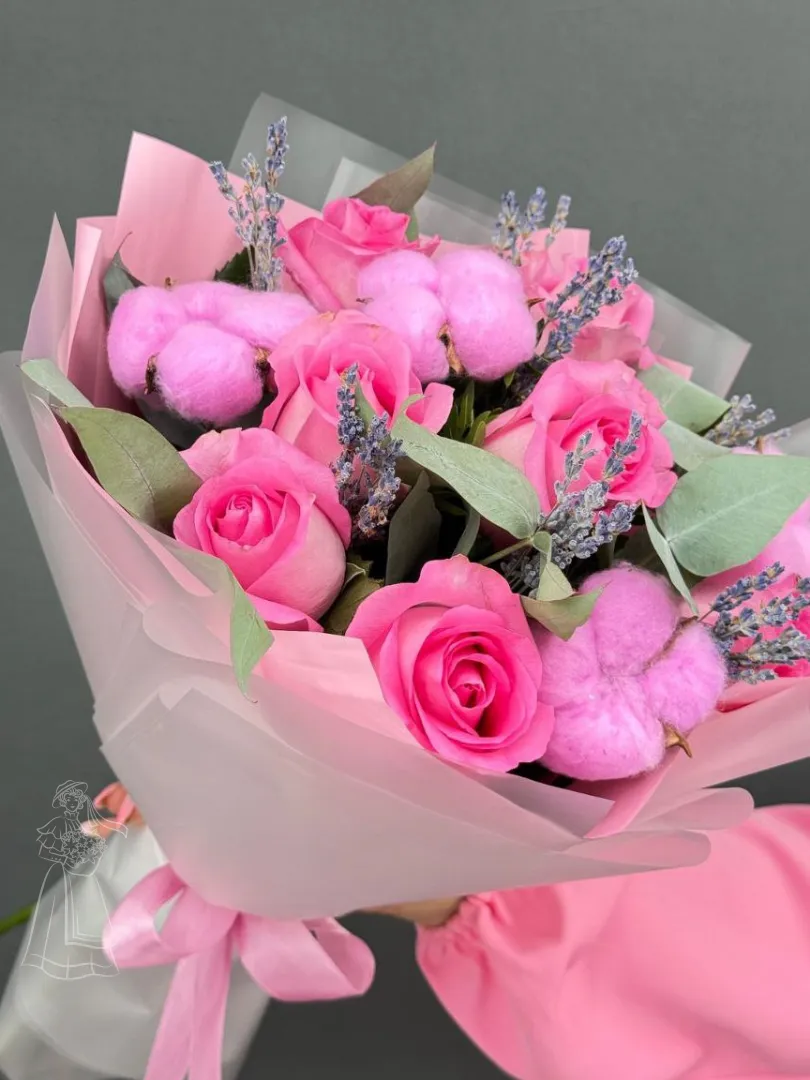 Букет розовых роз с добавлением хлопка и лаванды, элегантно упакованный в нежно-розовую бумагу. Сочетание ярких роз и воздушных пушистых коробочек хлопка создаёт уникальную текстуру и визуальный эффект. Этот букет станет прекрасным подарком для ценителей изящества и романтики.