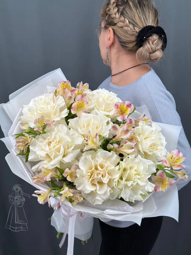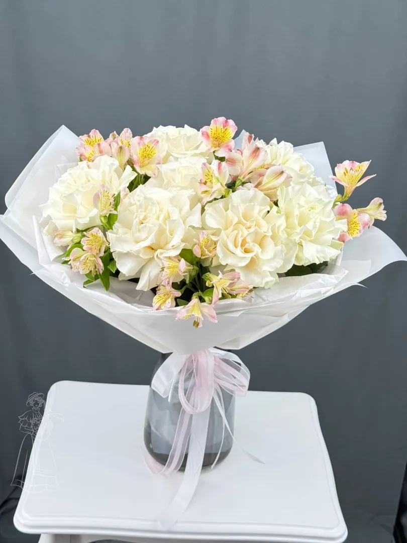 Представленный букет, это изящное сочетание белых французских роз и нежных альстромерий с легкими оттенками розового. Великолепные розы придают букету роскошный вид, а деликатные цветы альстромерии добавляют легкость и воздушность композиции. Букет прекрасно оформлен и станет прекрасным подарком для любого торжества.