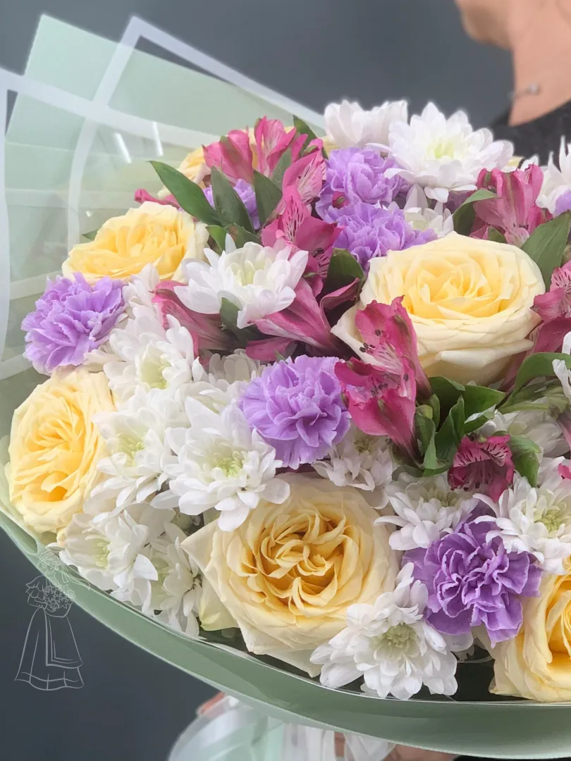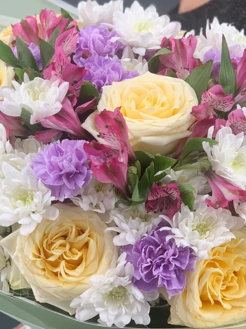 Букет Нежное настроение - это прекрасное сочетание цветов, создающее атмосферу легкости и беззаботности. В его состав входят кремовые розы, белые хризантемы, фиолетовые гвоздики, а также розовые альстромерии. Невероятная свежесть букета гарантировано поднимет настроение и наполнит интерьер светом.