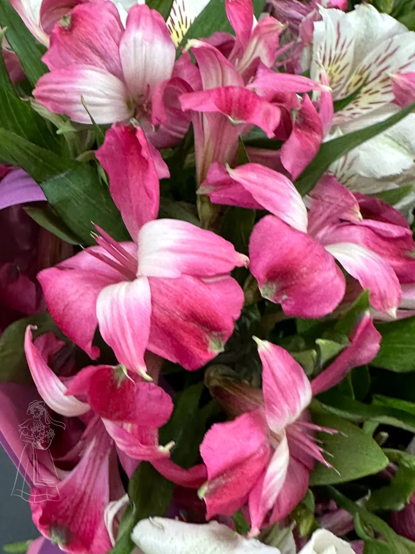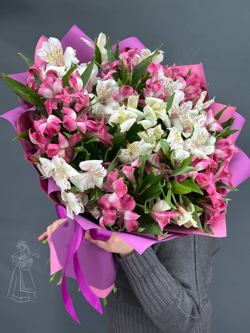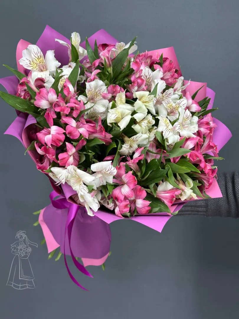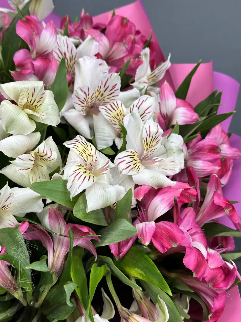 Описание букета Букет, составленный из нежных альстромерий розового и белого оттенков, создает трогательный и элегантный образ. Необычная цветовая гамма и изящные линии делают композицию привлекательной и запоминающейся. Идеальный подарок для любого торжества.