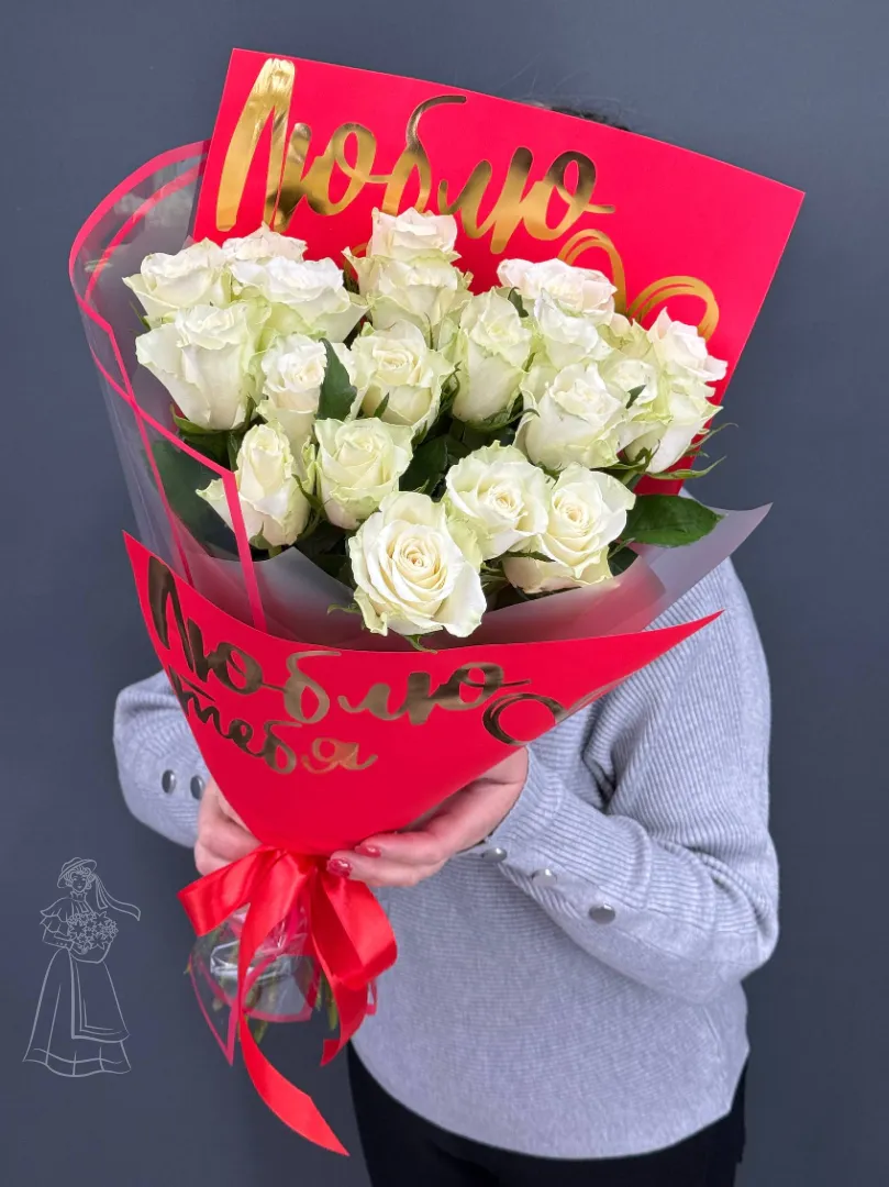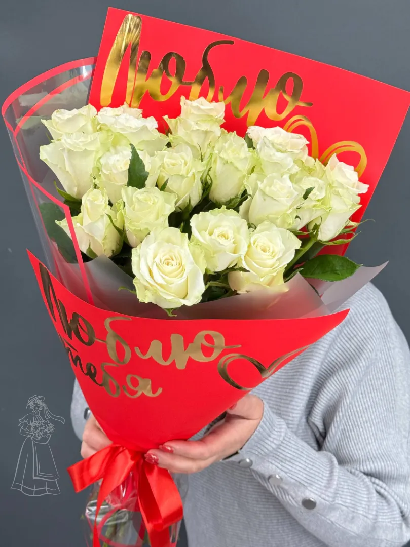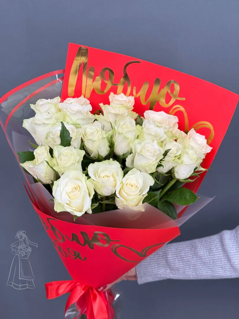 Букет из белых роз, элегантно упакованный в красную обёртку с золотыми надписями, станет прекрасным выражением любви и нежности. Нежные белые розы символизируют чистоту и искренние чувства, а яркая упаковка добавляет праздничное настроение. Этот букет идеально подойдёт для романтических моментов и особых событий.
