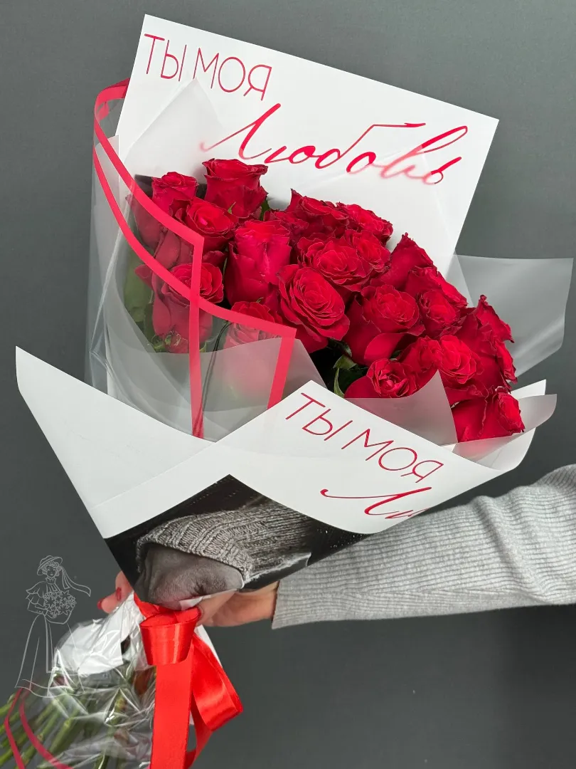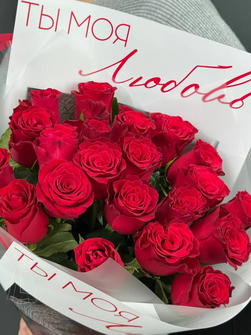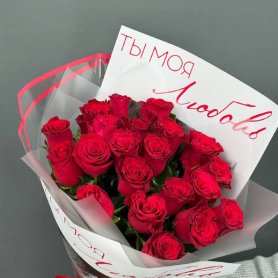Букет из 21 роскошных красных роз, символизирующих страсть и любовь, идеально подойдёт для выражения глубоких чувств вашей второй половинке. Нежная упаковка с трогательной надписью «Ты моя любовь» делают букет ещё более особенным и запоминающимся