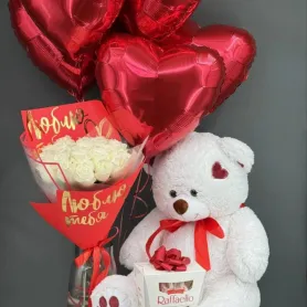 Букет из белых роз с трогательной надписью «Люблю тебя», сопровождаемый воздушными красными сердечками, плюшевым мишкой с красным бантом и конфетами - идеальный подарок для самых близких. Этот нежный и романтичный набор обязательно порадует вашу любимую.