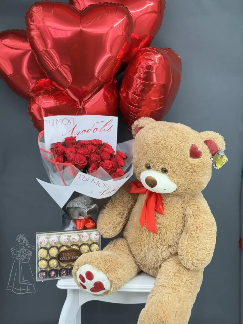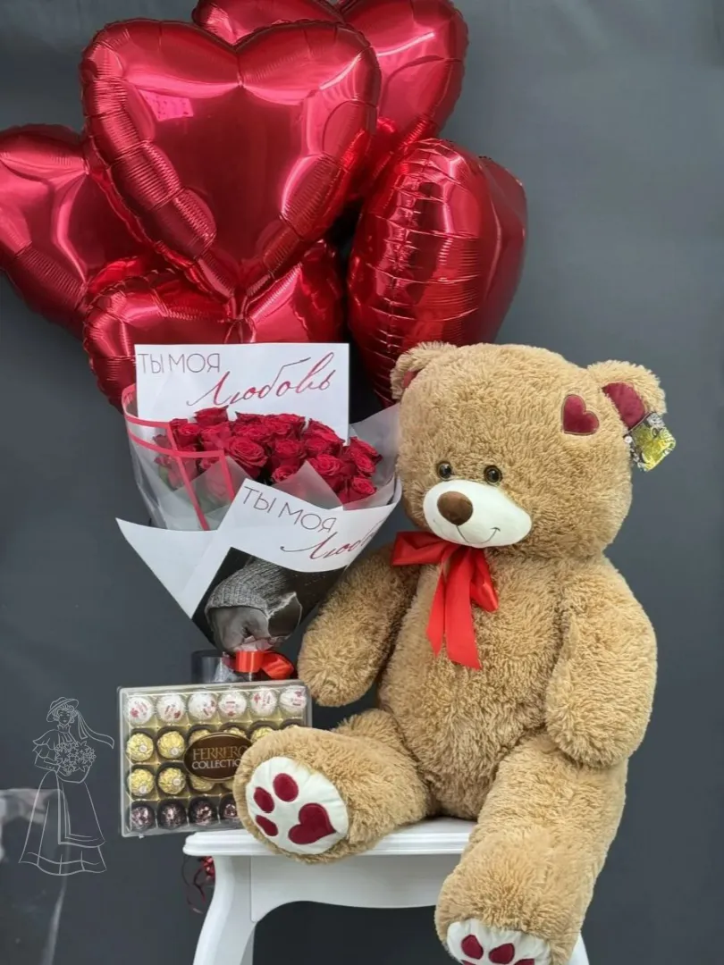 Подарочный сет для влюблённых, состоящий из воздушных шаров в форме сердца, букета красных роз и плюшевого мишки. Сет дополнен коробкой конфет.