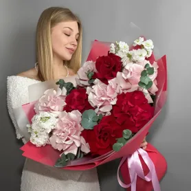 Букет из роз и маттиолы- это классическое сочетание элегантности и романтичности. Нежные оттенки цветов создают трогательный образ, идеальный для выражения любви и признательности.