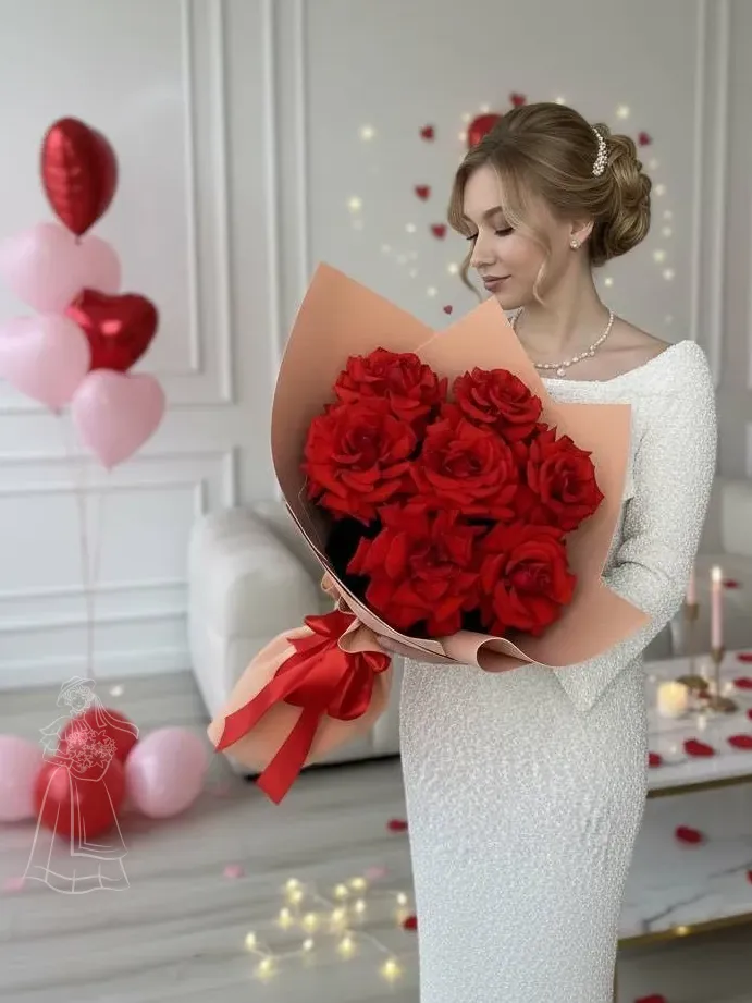 Пышный букет из ярких красных роз, элегантно завёрнутый в нежную бежевую бумагу с атласным бантом. Этот классический подарок символизирует страсть, любовь и безграничное восхищение. Идеален для самых трогательных моментов и романтических сюрпризов
