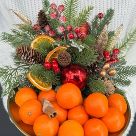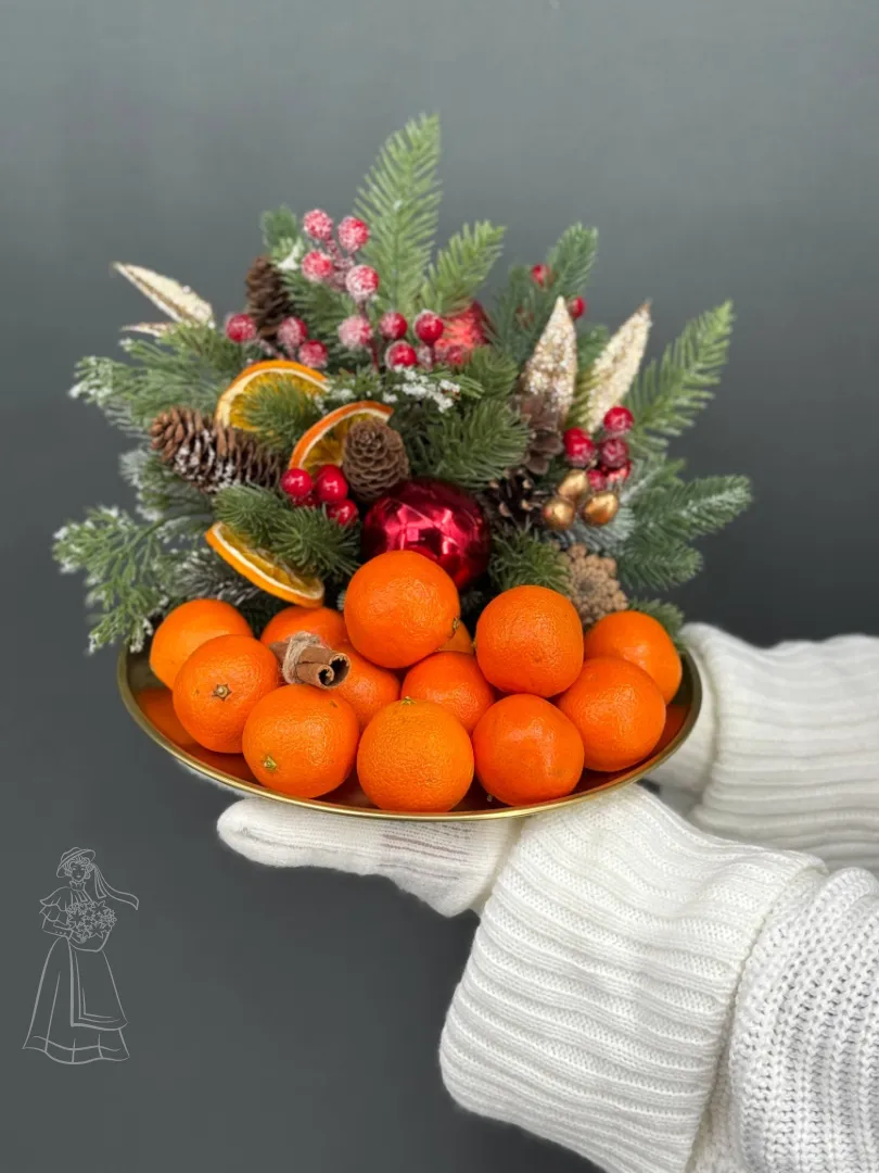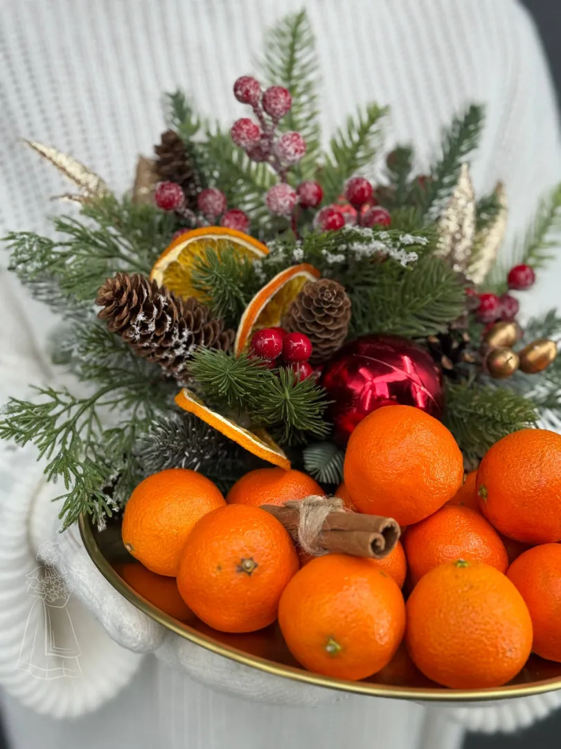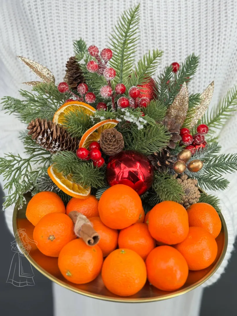 Описание букета Праздничная композиция на блюде с яркими оттенками новогоднего настроения. Свежие мандарины, шишки, красные ягоды и новогодние украшения создают гармоничное сочетание природных элементов и праздничного декора, наполняя пространство теплом и уютом. Эта композиция станет прекрасным подарком или украшением для дома в преддверии праздников.