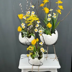 Пасхальная композиция из искусственных цветов с фигурками украсит интерьер, поддержит праздничное и радостное настроение. Композиция может стать милым и незабываемым подарком в этот праздник.