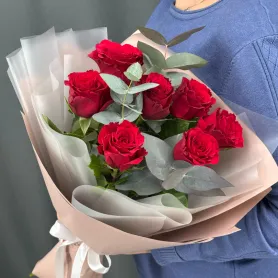 Стильный букет- комплимент из 7 красных роз и ароматного эвкалипта