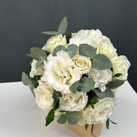Нежный букет невесты из белых махровых эустом. Такой букет смотреться очень элегантно и стильно. Зелень эвкалипта придает букету лёгкость, при этом существенно увеличивает его объём, а приятный аромат наделяет цветочную композицию особенным очарованием